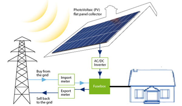 In an On-Grid solar system, the power generated from the solar panels are connected to the electricity department’s grid. Power is drawn directly from the grid for consumption by the utilities in home/commercial buildings. The power consumed and power sent to the grid are calculated by a net meter that calculates the power transmission both ways and displays the outstanding power if consumed by the consumer or sent to the grid.